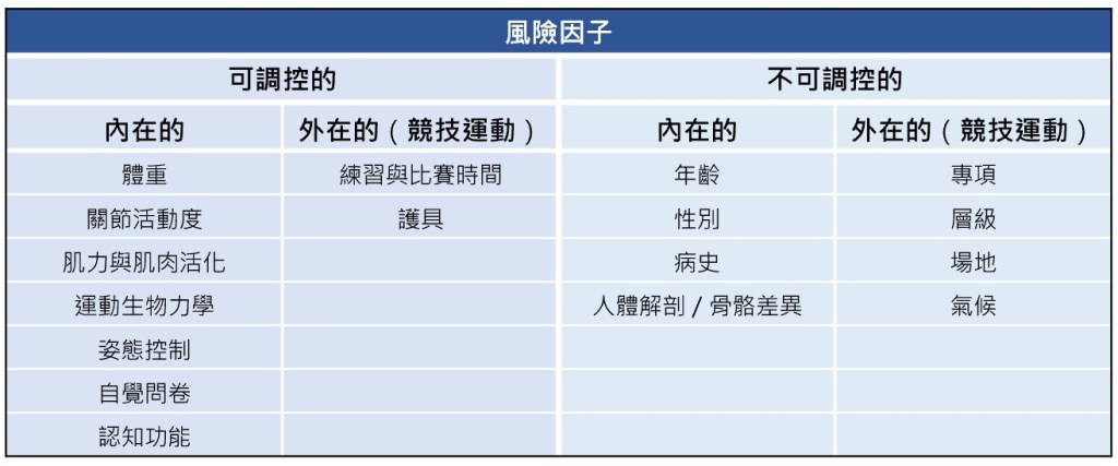 - 內在風險因子需盡可能地被降到最低,目的為保護運動員參與及適應外在環境時,較不會受傷。