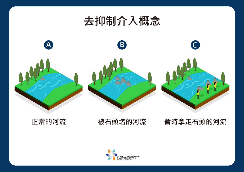 - 「去抑制」的方法,概念上和移除河道障礙類似:AMI 的去抑制介入原理可比喻為「移除神經傳導的障礙」,如同將堵住河流的大石頭移開,有正常的神經肌肉訊號傳導,恢復肌肉的正常徵招功能。