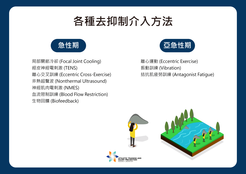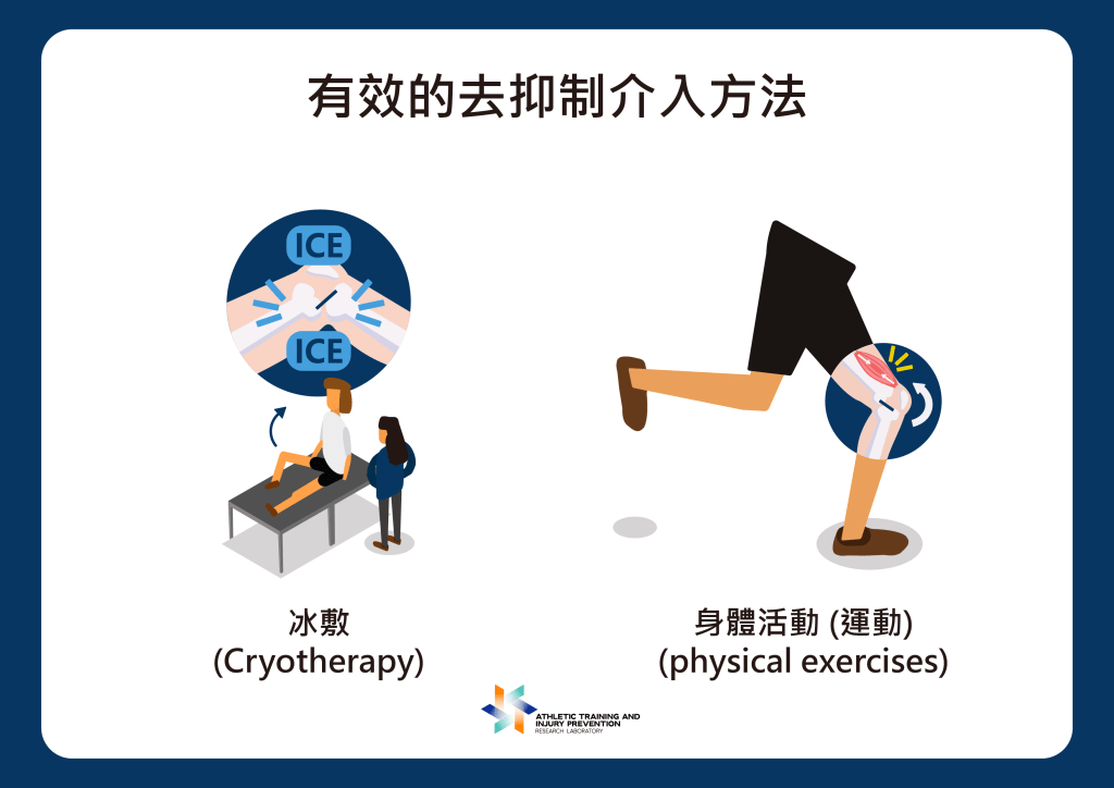- 推薦的去抑制方法:根據研究,冰敷與運動被證實為有效的去抑制方法,適合在急性期作為解決 AMI 的有效方法。。