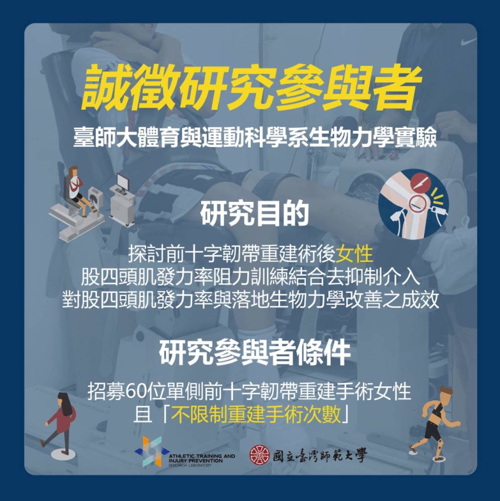 由黃昱倫老師主持的運動防護與傷害預防實驗室,正在進行女性前十字韌帶術後關節性肌肉自主抑制的相關研究,並有8週免費的去抑制介入與運動訓練。