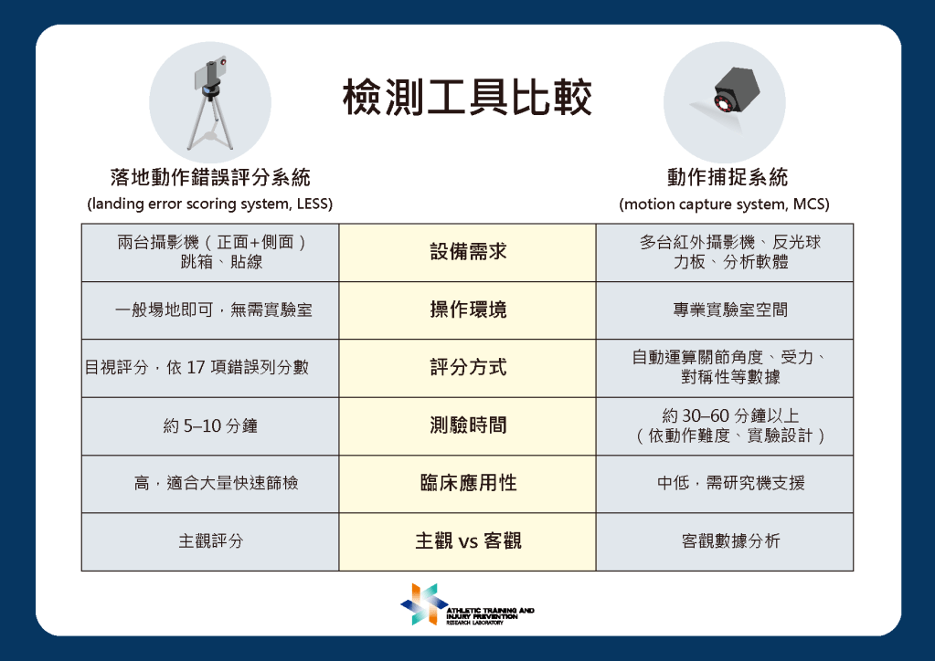 了解動作錯誤是一回事,但要精準測量動作中潛藏的受傷風險因子,所使用的工具就非常關鍵。 以下是臨床常用的 LESS,以及研究用的 MCS 兩者的比較,幫助你了解不同方法在評估 ACL 風險時的差異與應用情境 (圖:檢測工具比較)。